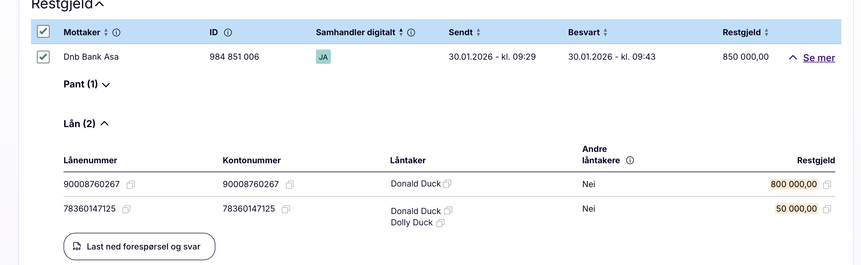 Banken som har pant samhandler ikke digitalt. Disse er markert med NEI i tabellen med panthavere og kan ikke forespør.