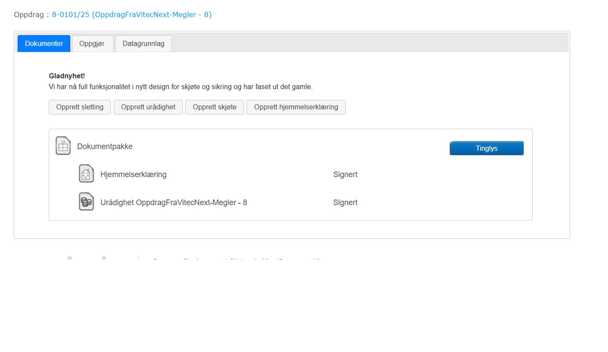 Under utviklingen av denne løsningen har vi erfart at meglerselskaper har ulike arbeidsmetoder ved omsetning av slike objekter. Retningslinjene og kravene som gjelder på din arbeidsplass endres ikke ved bruk av digitale dokumenter. Følg derfor de etablerte rutinene der du er ansatt, med hensyn til hvem som tinglyser hva, og når.